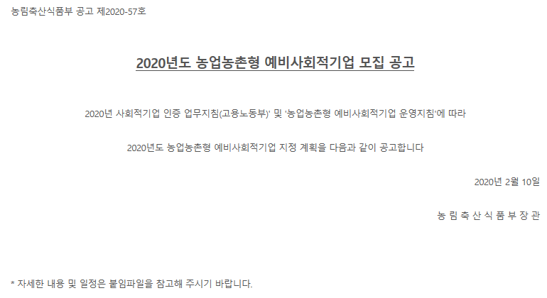 2020년도 농업농촌형 예비사회적기업 모집 공고(상시접수) 20-04-03 08:53 본문 2020년도 농업농촌형 예비사회적기업 모집 공고(상시접수) 첨부파일 2020년도 농업농촌형 예비사회적기업 모집 공고.hwp (99.0K) 3회 다운로드 | DATE : 2020-04-03 08:53:36 목록