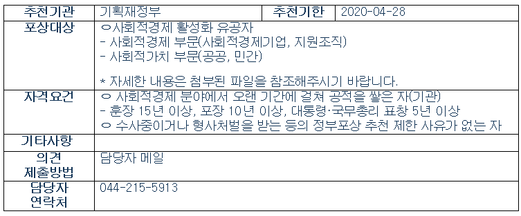 2020년도 사회적기업 육성 유공 장관표창 공고(기획재정부)