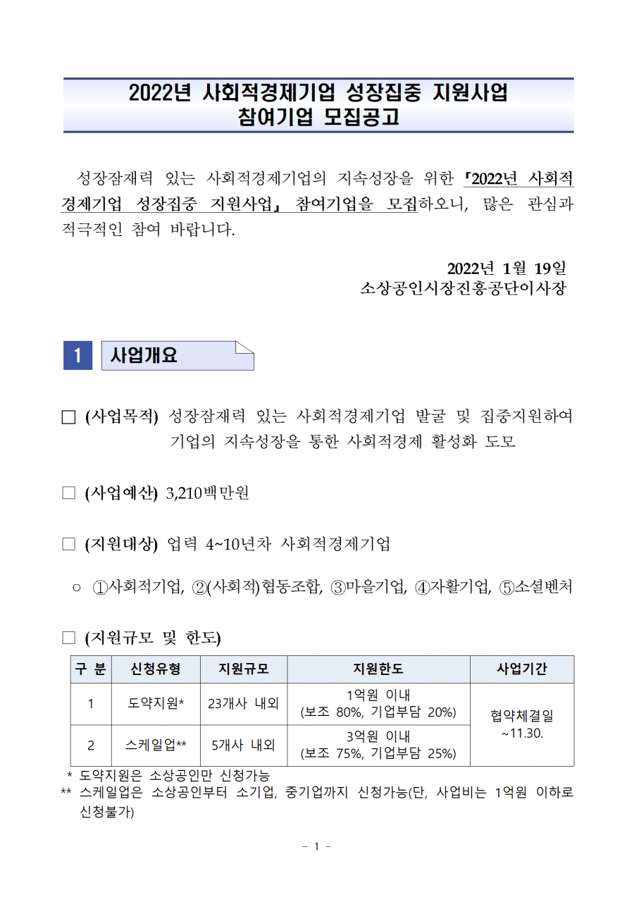 2022년 사회적경제기업 성장집중 지원사업 참여기업 모집공고(~2/4)