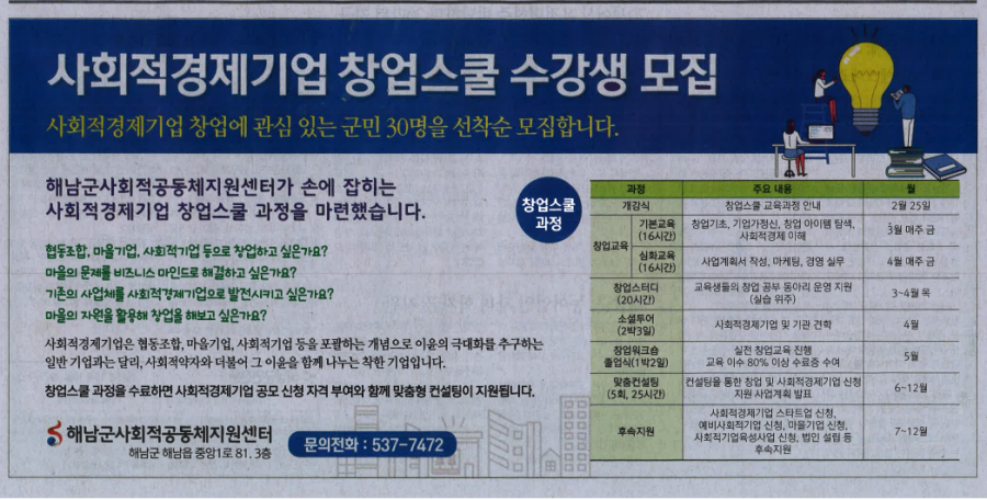 * 문의처: 061-537-7472 (해남군사회적공동체지원센터)