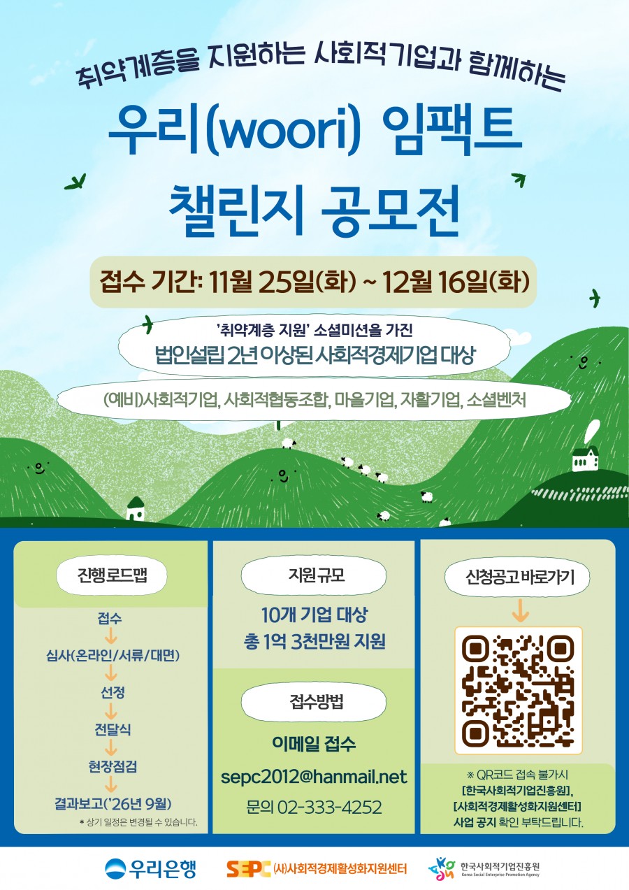 취약계층을 지원하는 사회적기업과 함께하는 우리(Woori) 임팩트 챌린지 공모전을 개최합니다.